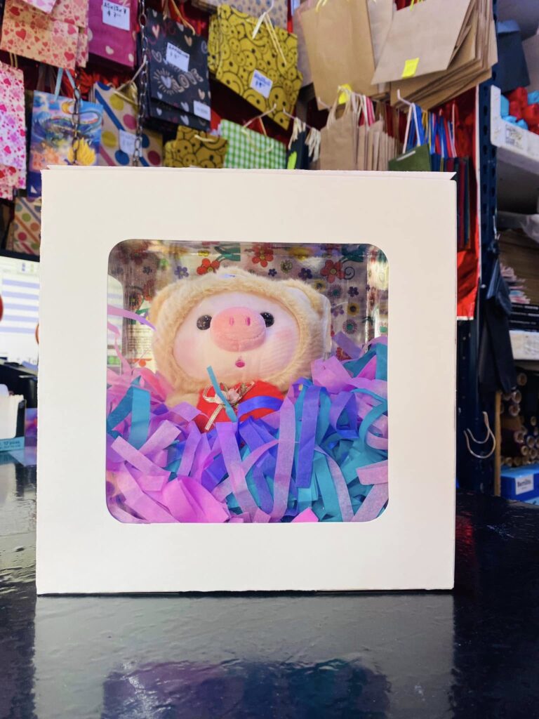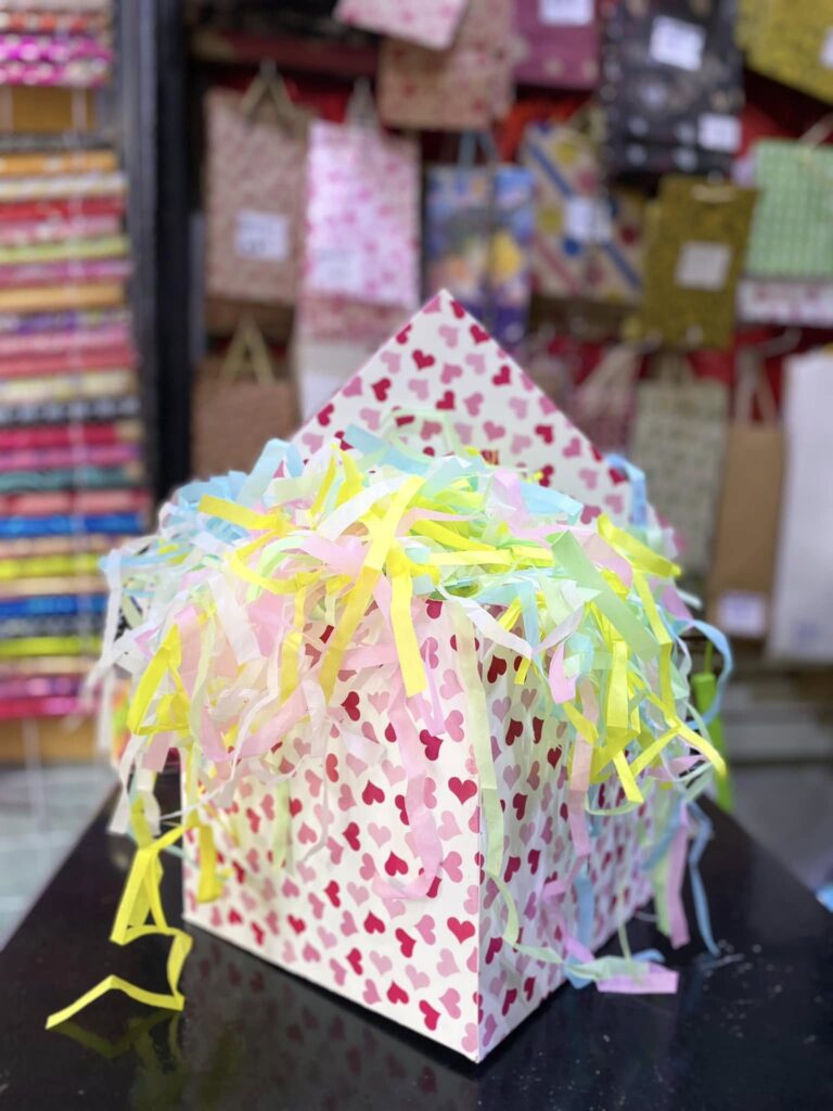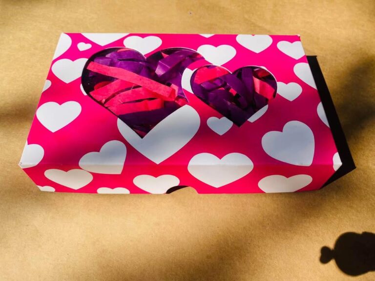 Cajita de caple impreso con corazones, ideal para envolver un pequeño regalo.