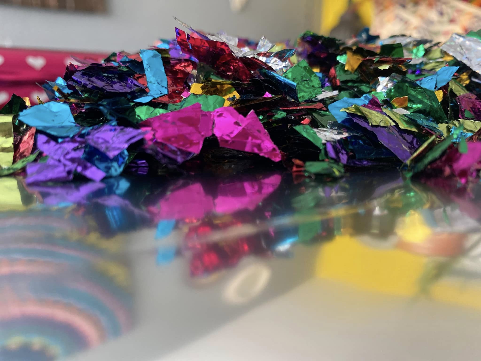 Papel metalizado triturado ideal para bazucas, brillante y de colores intensos, también puedes usarlo para decorar piñatas, relleno en regalos, entre otros usos.