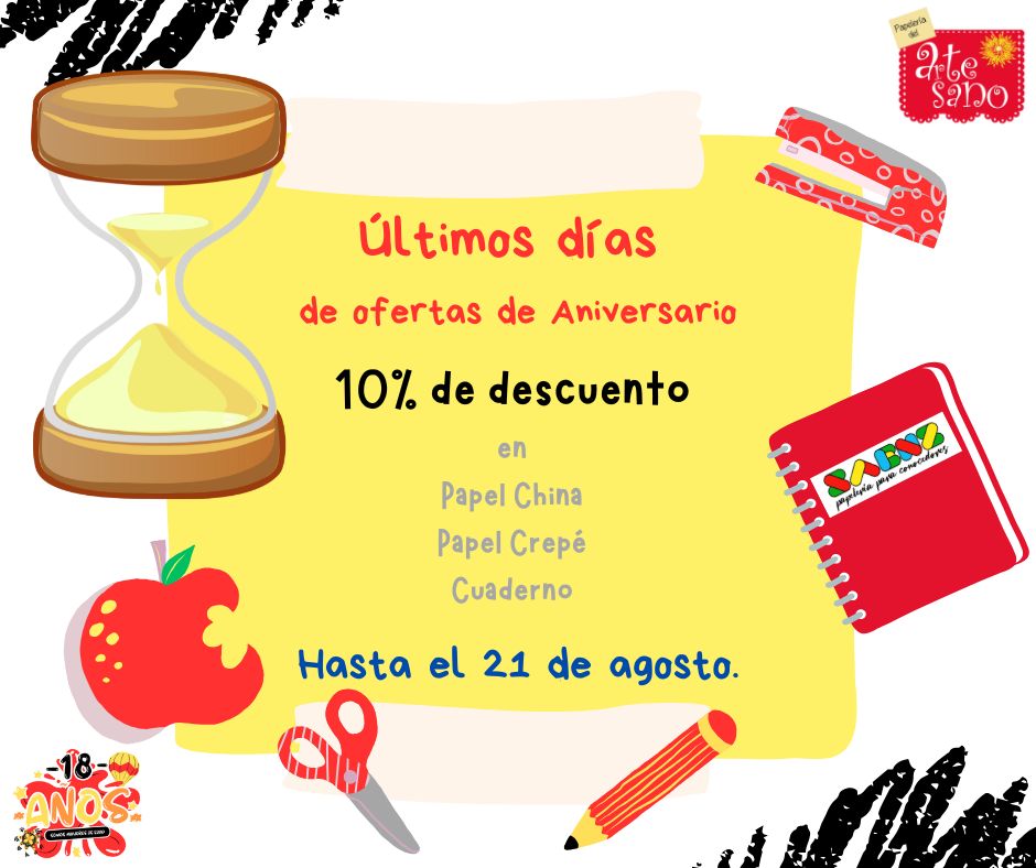 Después de un mes de haber cumplido 18 años, estamos a punto de terminar nuestro periodo de promociones, te invitamos a asistir a cualquiera de nuestras sucursales y aprovechar nuestro 10% de descuento en papel china, papel crepé y cuadernos.